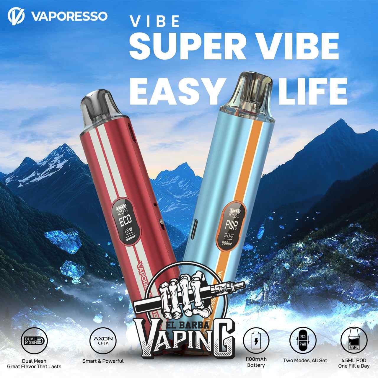Shop the Vaporesso VIBE Pod System, featuring an 1100mAh battery, ECO and PWR Modes, and offers a 4.5mL refillable pod capacity with dual mesh coils.